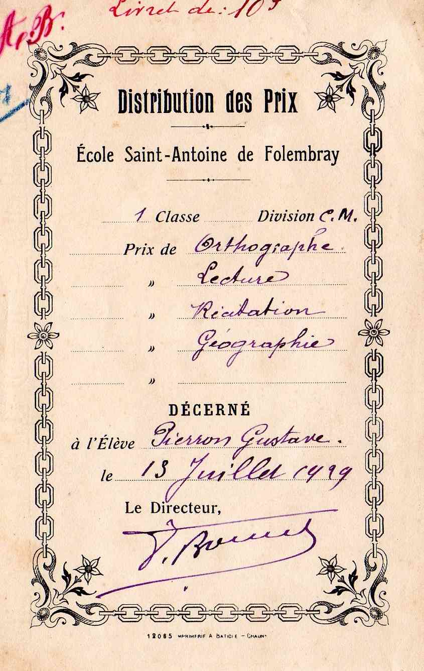 | prise de vue vers 1960 de la rue Bernard Lefévre. On peut observer l'ancienne cour de récréation de l'école Saint Antoine. | Diplome d'un élève de l'école Saint Antoine |